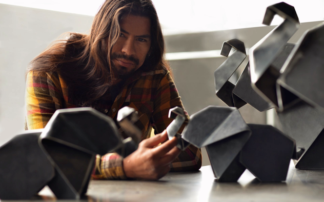 Renown for his bold, origami-inspired, metal sculptures that explore psychologically complex themes; Hacer’s introduction to the nostalgic art form began at age seven when a volunteer in one of his foster homes read, “Sadako And The Thousand Paper Cranes” by Eleanor Coerr.